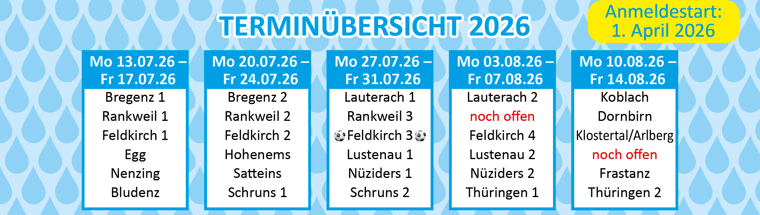 | 27.07. – 31.07.2026 | Lauterach 1, Rankweil 3, Feldkirch 3 (Oberau; Tschutta & Tricksa), Lustenau 1, Nüziders 1, Schruns 2 |